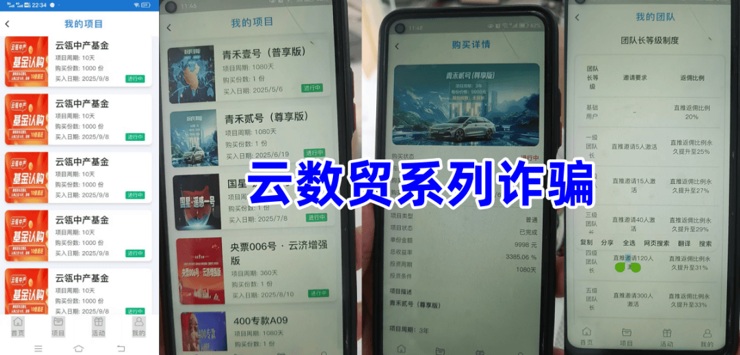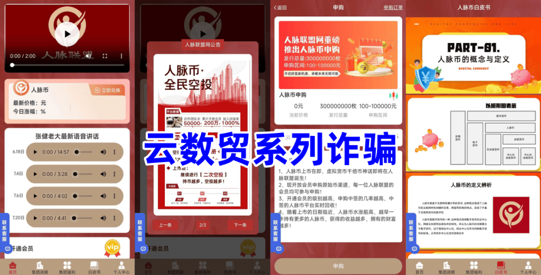 不法分子冒充“云数贸张健”的旗号,制作散布涉诈APP,声称推出发行3亿枚“人脉币”,参与者实名注册即可获得,每一枚最低最低100元,采用传销模式发展下线,拉人越多,返利越多。