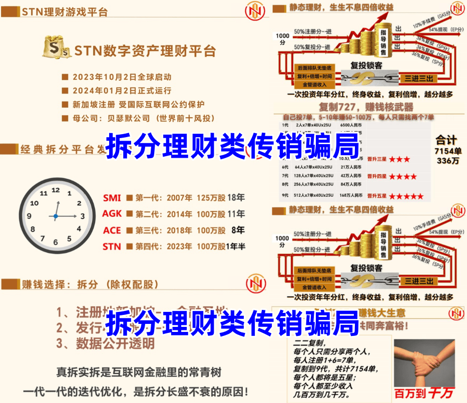 不法分子打着拆分游戏理财的旗号,声称公司注册与新加坡,发行电子股票,参与者缴纳7600元加入,静态可以获得4倍收益,发展下线可以获得动态收益。