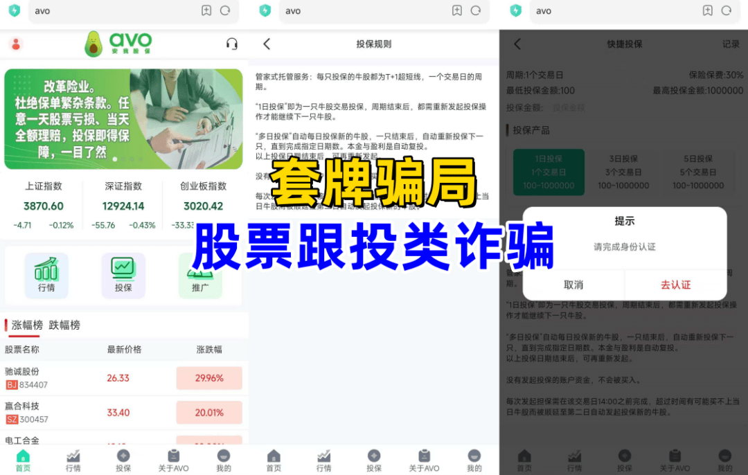 不法分子冒充香港“安我保险”公司的名义,制作散布涉诈APP,声称参与者跟着“专家”购买股票,参与者投资后2个月即可回本,有保险公司托底,确保稳赚不赔。