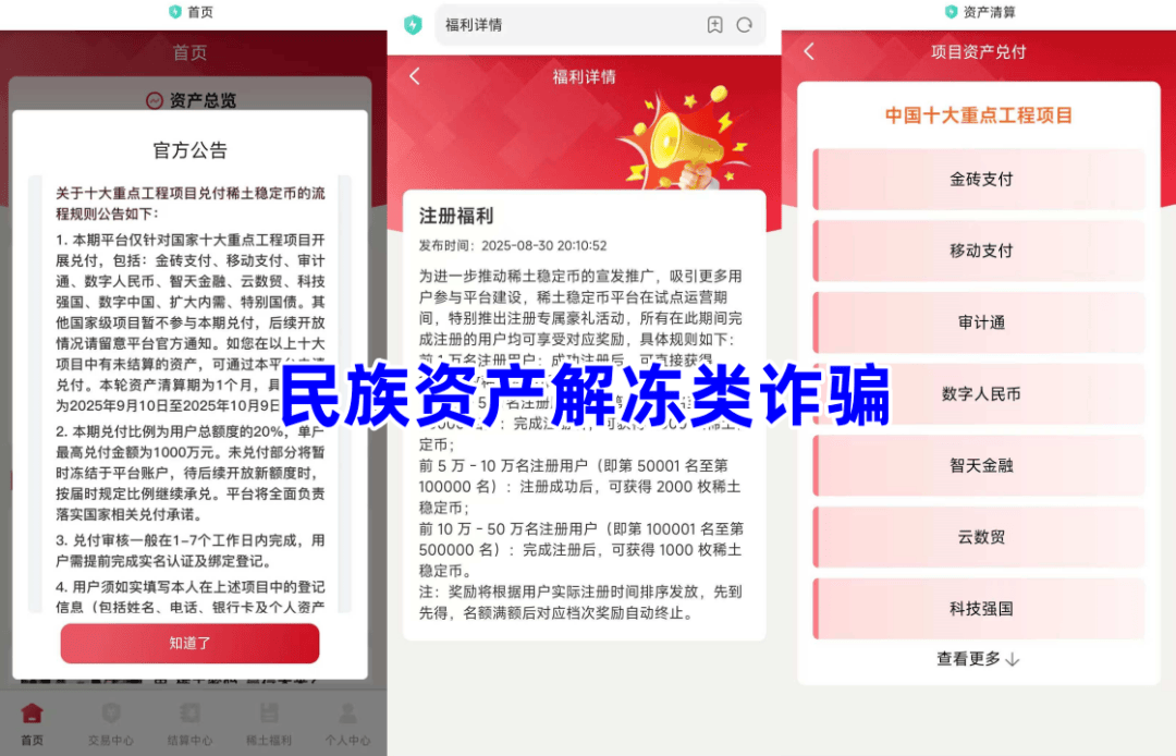 不法分子打着“稳定币”的旗号,宣称“蚂蚁集团与中国人民银行、中国稀土集团共建全球首个稀土人民币稳定币”,制作散布涉诈APP,声称实名注册,即可获得1000至10000枚稀土币,可兑换“金砖支付”“审计通”“云数贸”“智天金融”等涉诈项目资金。