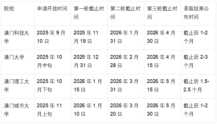 2025 年 12月:提交澳门大学、澳门理工大学第一轮申请;跟进已提交申请的材料审核进度。部分院校需邮寄纸质材料,提前联系快递公司,预留1 周邮寄时间。